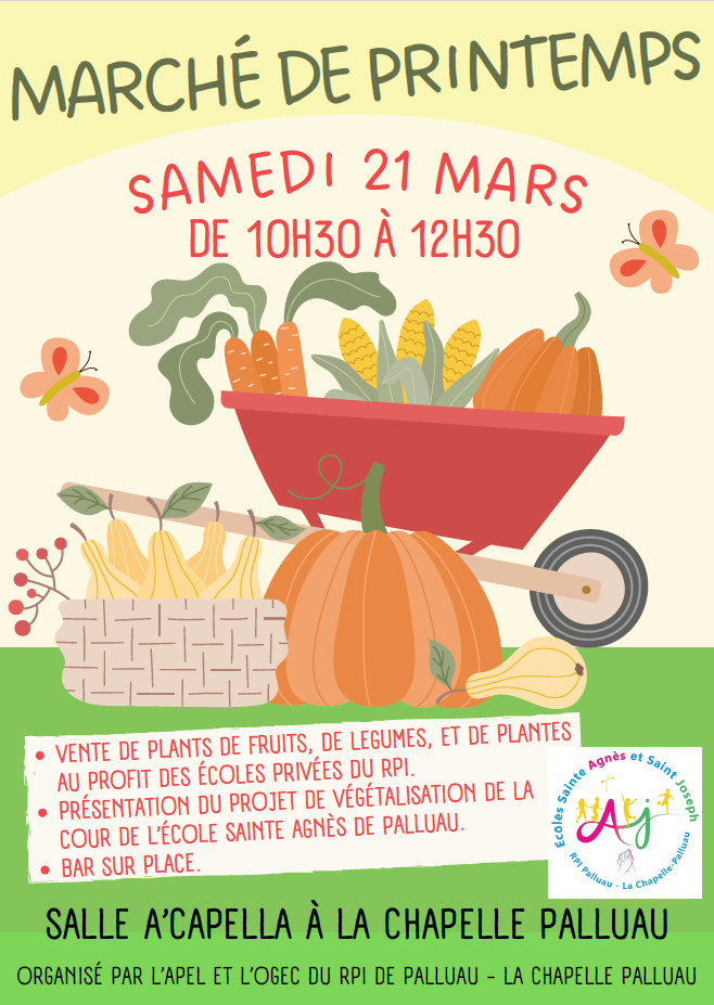 L’APEL et l’OGEC du RPI de Palluau – La Chapelle Palluau vous donnent rendez-vous pour célébrer l’arrivée du printemps lors d’un marché convivial et solidaire !